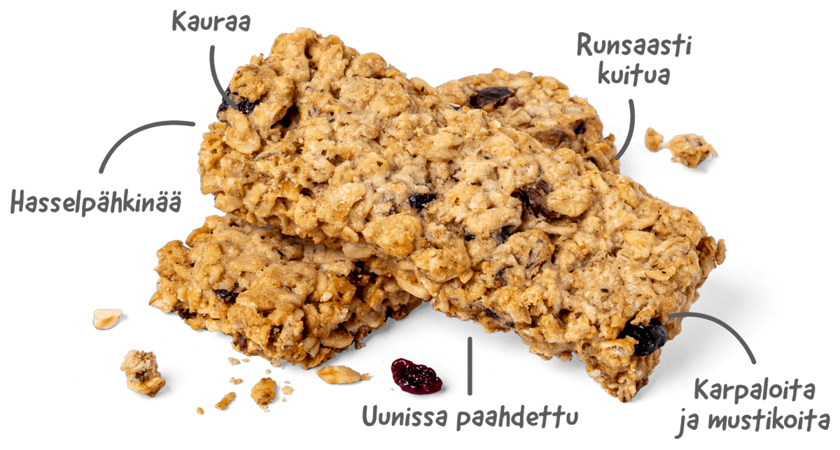 Maukkaita mustikoita ja herkullisia karpaloita. Rapeita hasselpähkinöitä ja suussa sulavaa paahdettua kauraa.